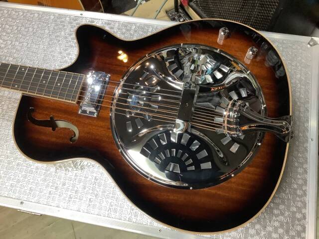 ◆ リゾネーターギターは内部にアルミコーン ( アルミの鍋の蓋のような円錐形の皿) が入っていて、弦振動がアルミに響きサスティーンの効いた乾いた魅力の響きになります。